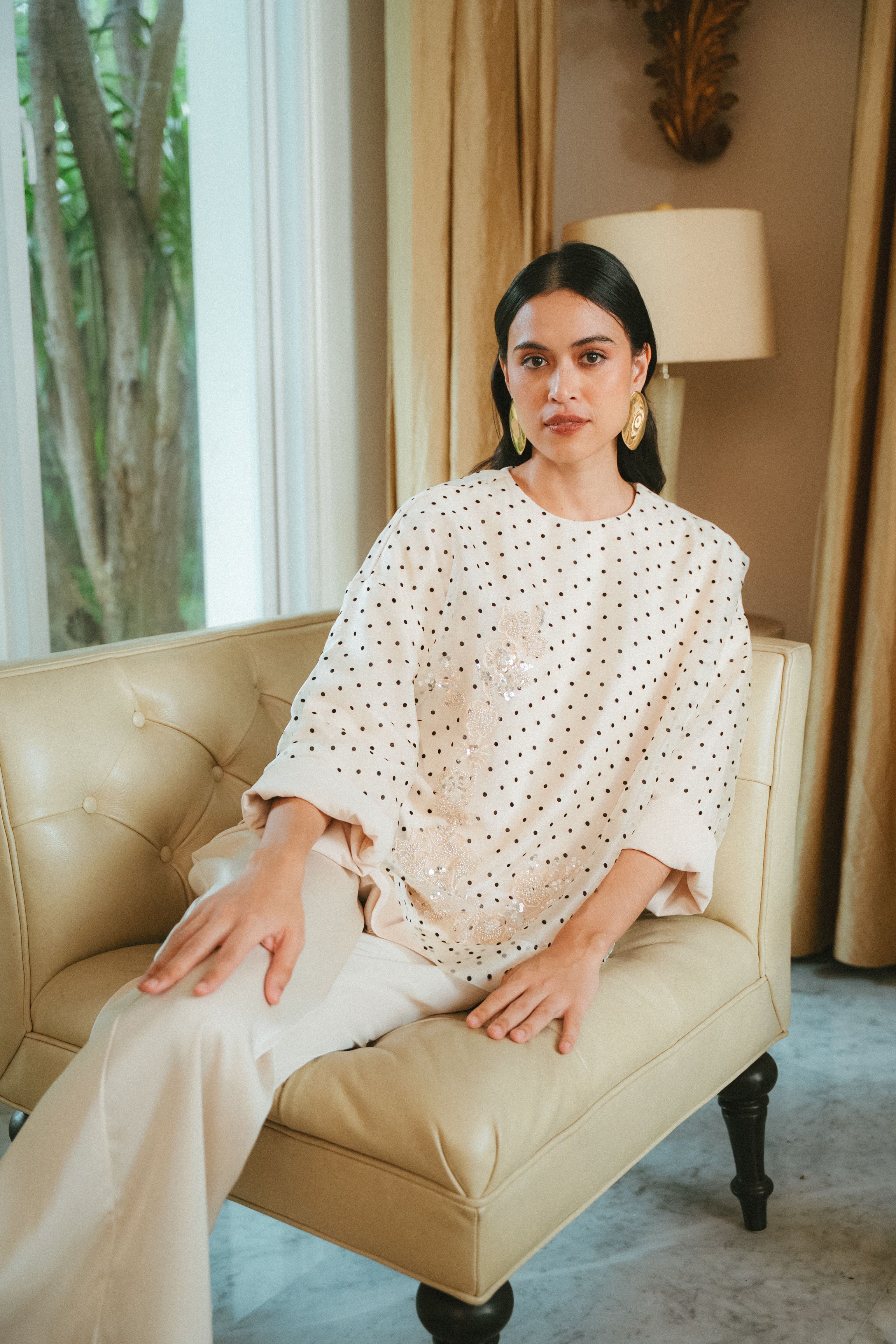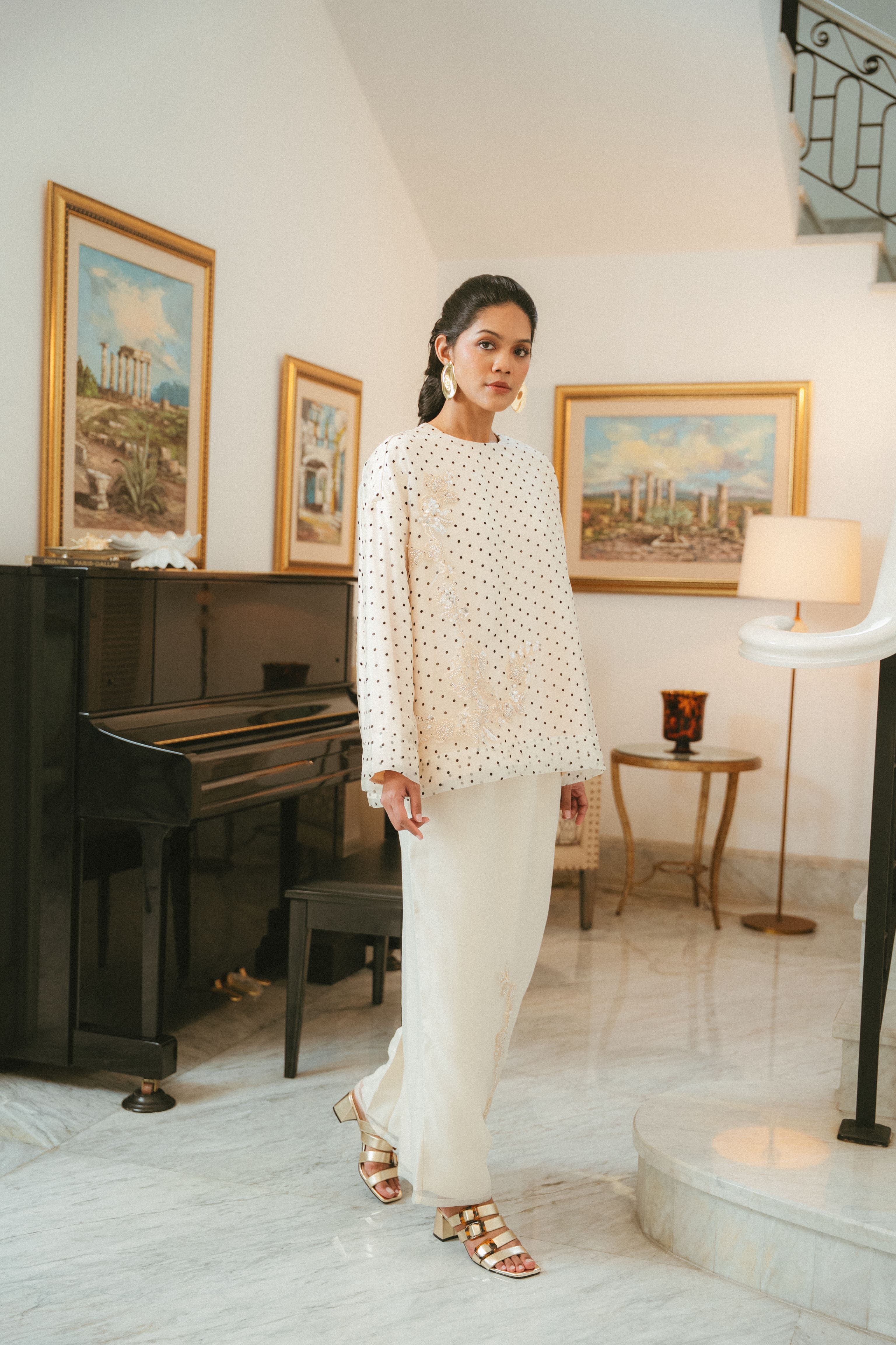 Our Camelia is style personified. She exudes relaxed sensuality in the boxy silhouette with the lushness of the organza.
