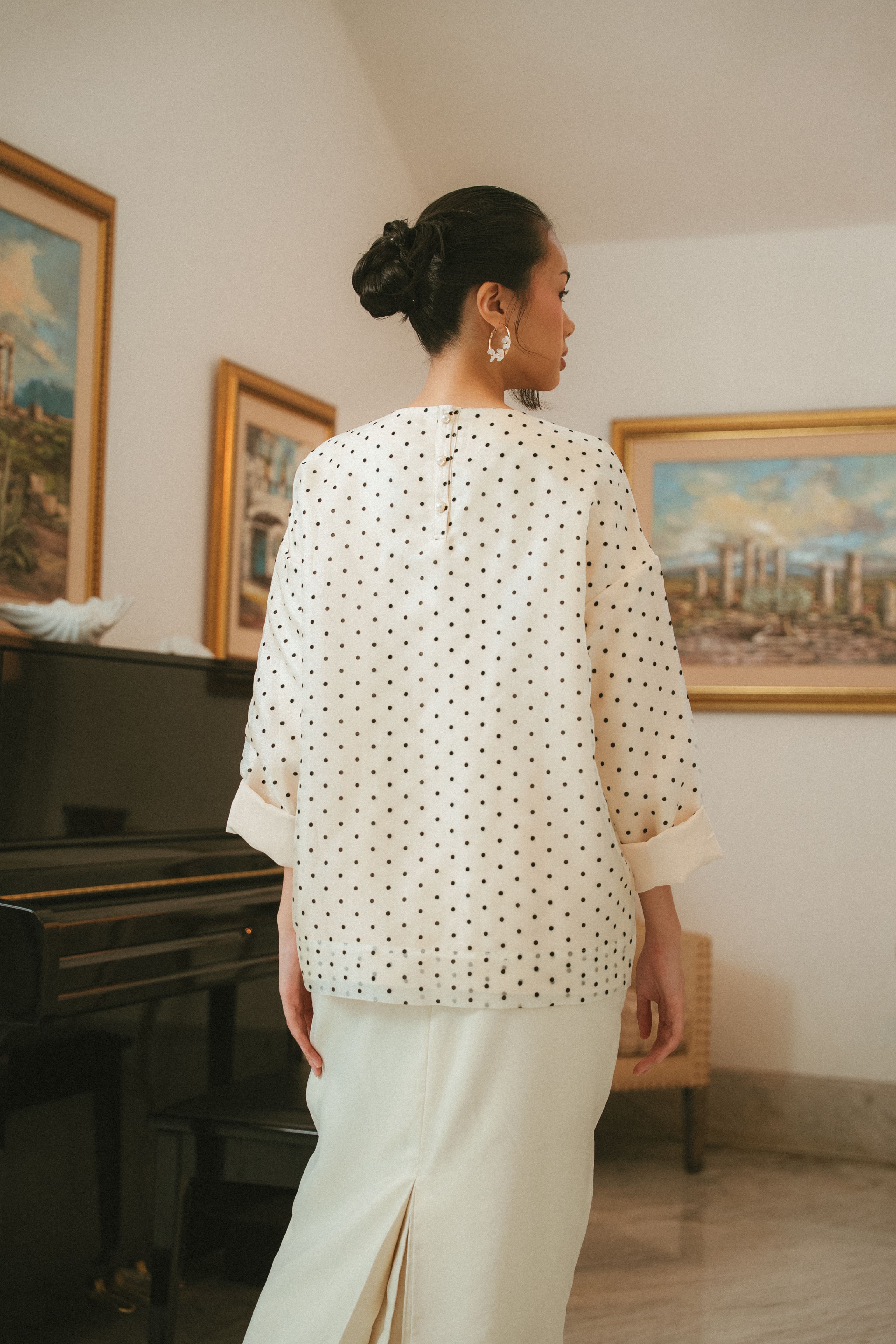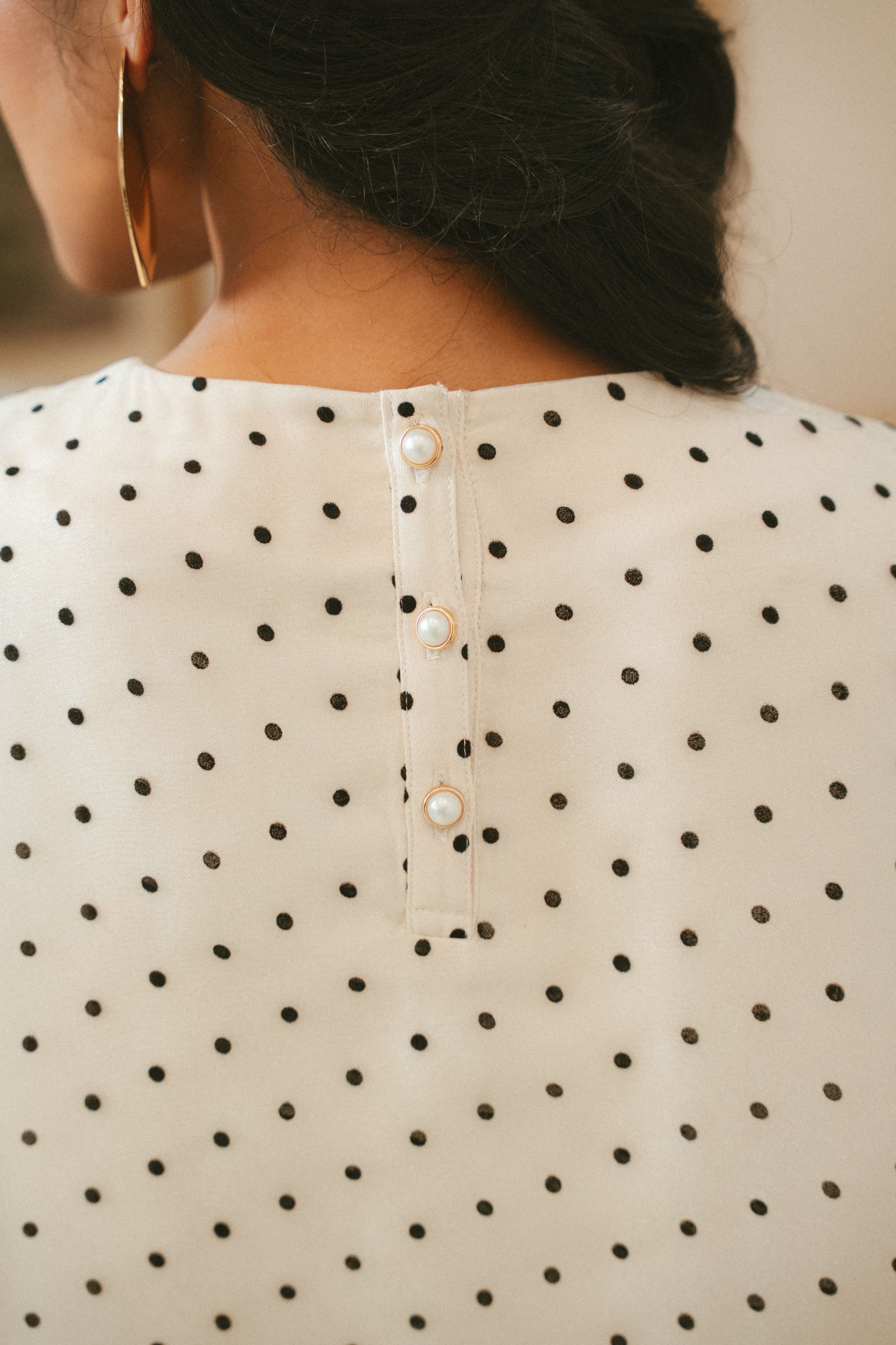 • Boxy top with pearl buttons at the back