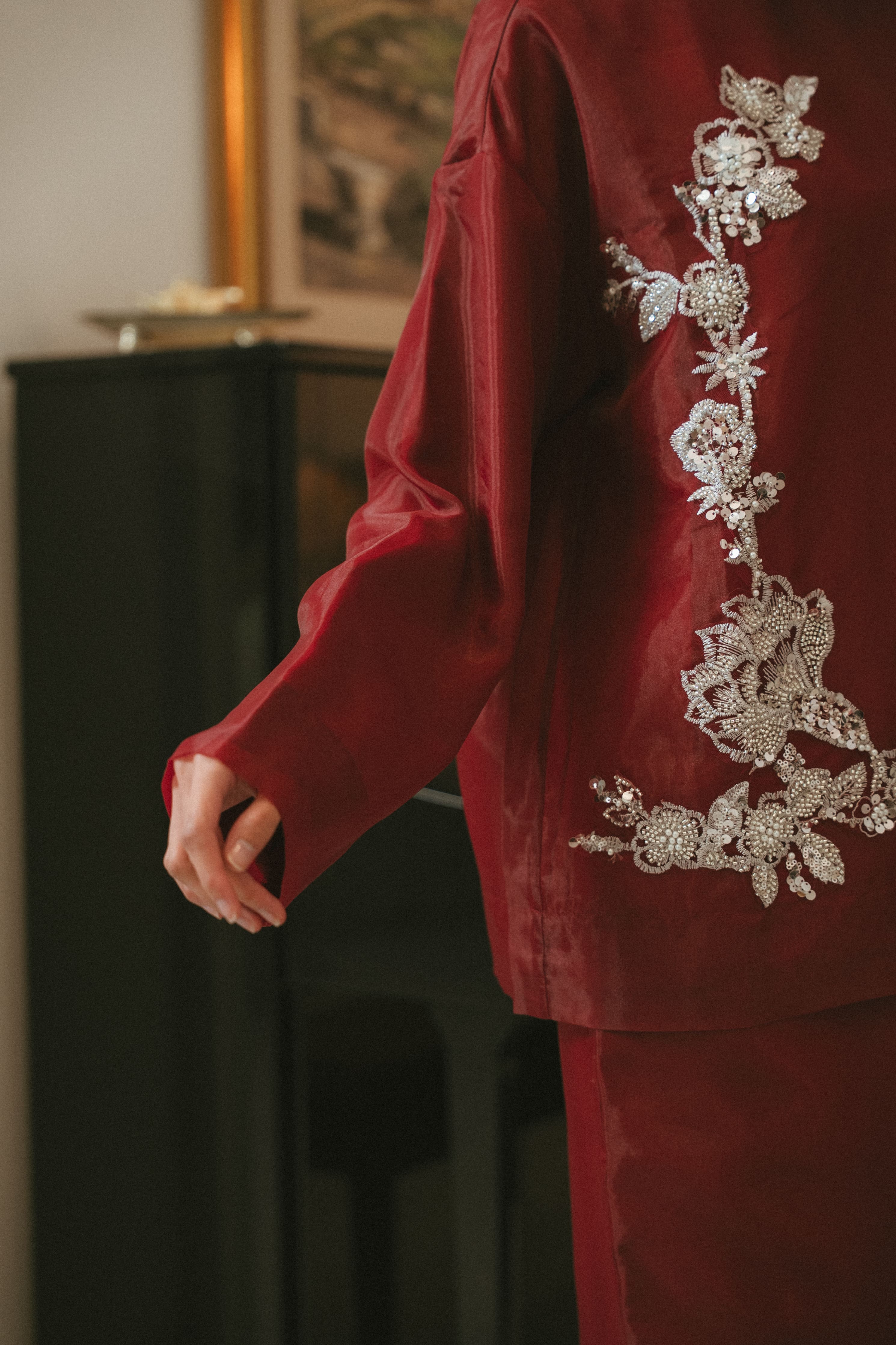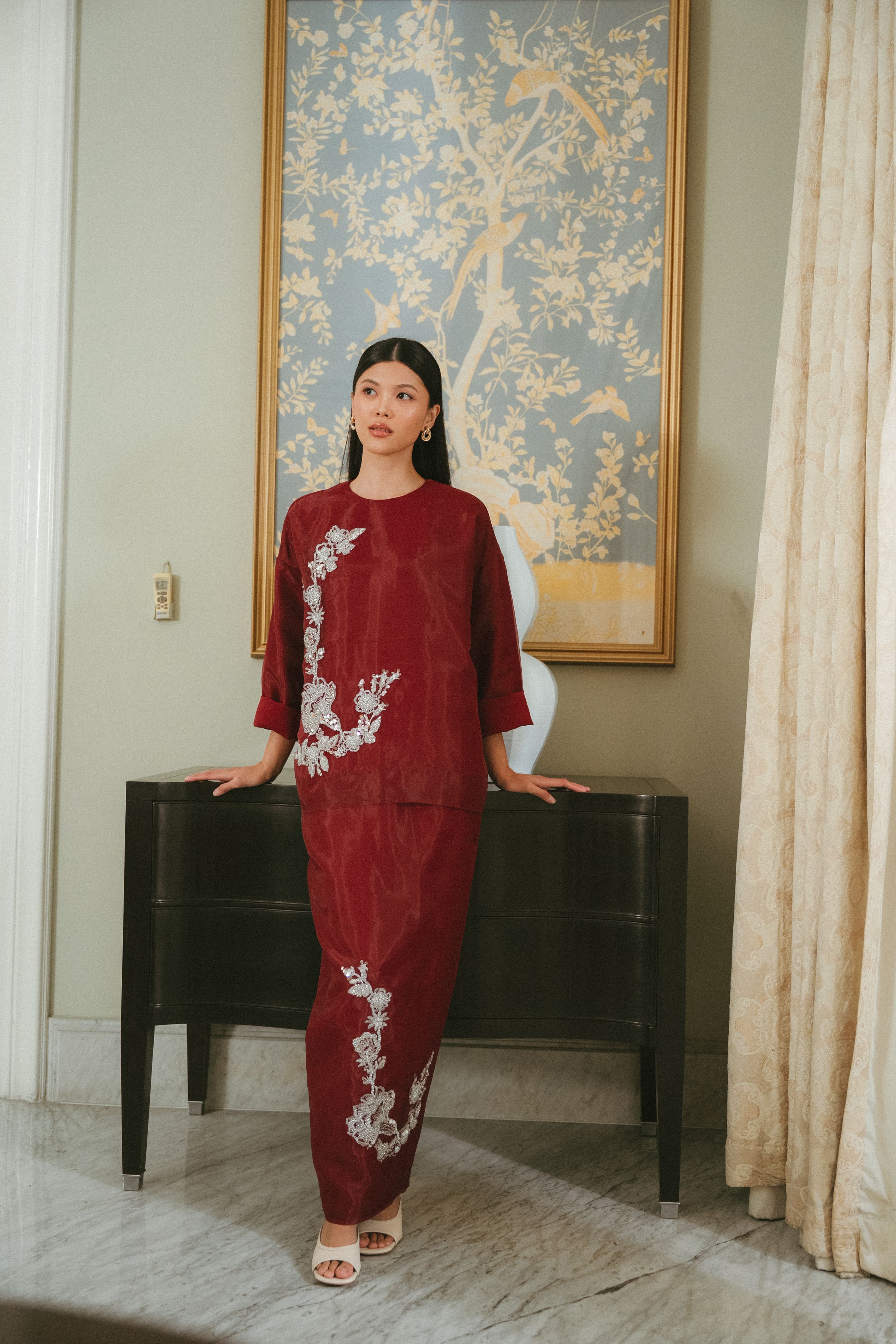 A garment like this asks for tenderness. Choose a looser fit (highly advisable to avoid a tight fit) & to handle with care. Treat it gently & it will drape and shimmer beautifully with every wear.