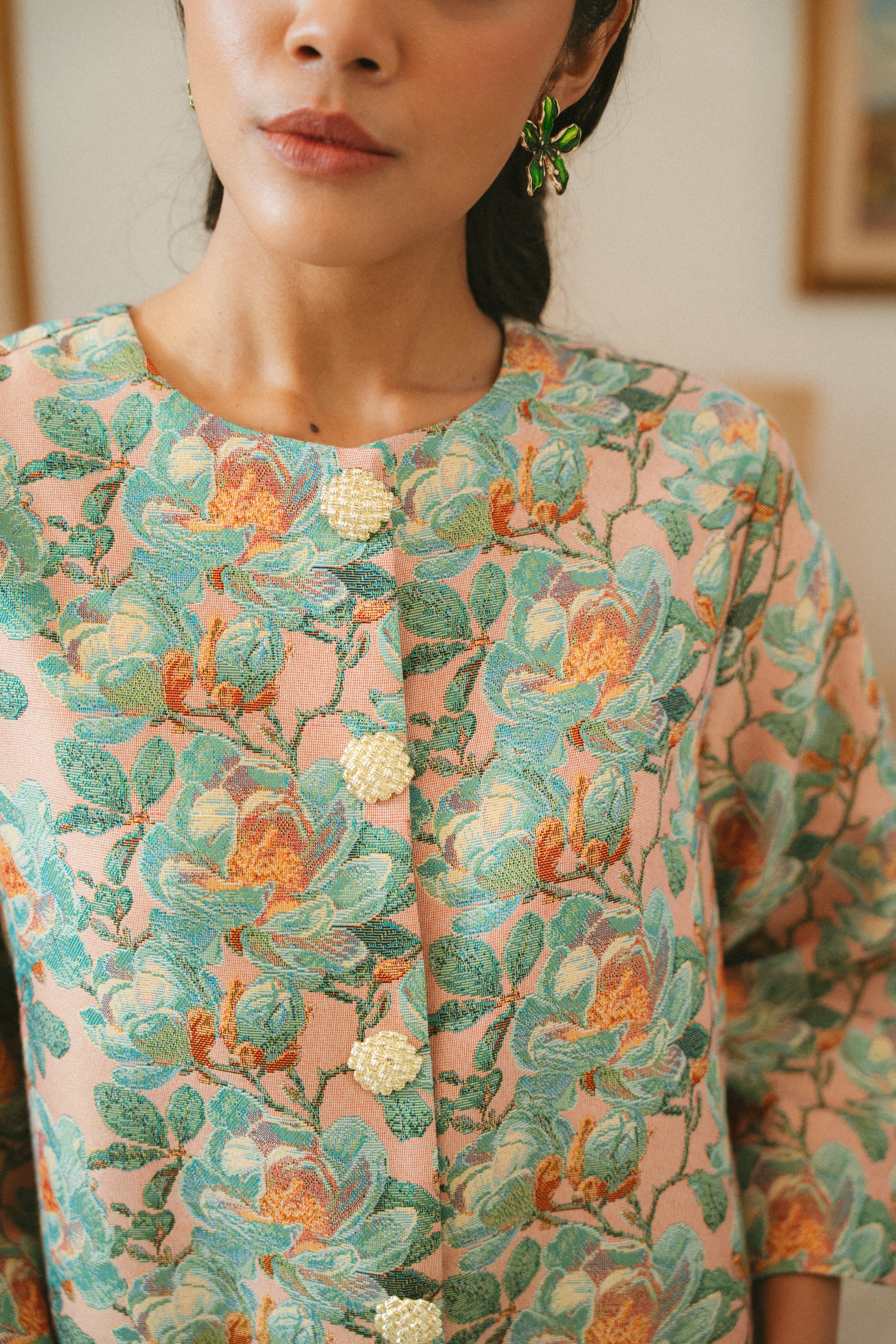 Our Majorelle now comes in an elegant new hue made of lush floral soft jacquard in shades of blush pink and baby blue. It is both timeless & beautiful.